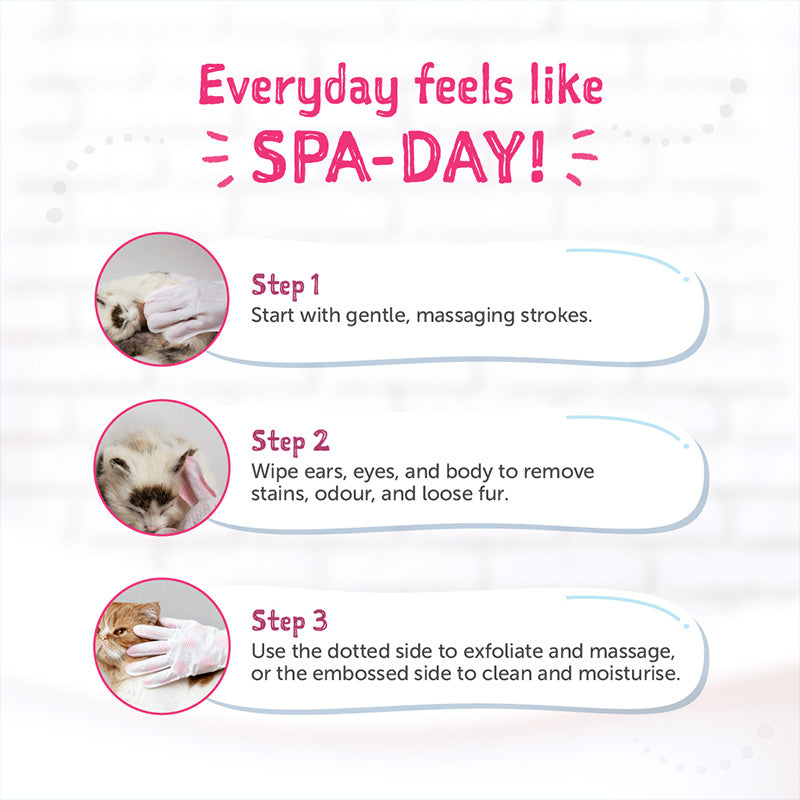 Clean-A-Cat is a mini spa session slipped into your hand for the cats. Each glove is infused with skin-loving ingredients like Jojoba Oil and Shea Butter for deep hydration, plus Cica Extract to soothe sensitive skin. It’s lick-safe and great for all breeds and sizes. The dual size design gives cats double the pampering so they feel fresh, clean, and absolutely loved.